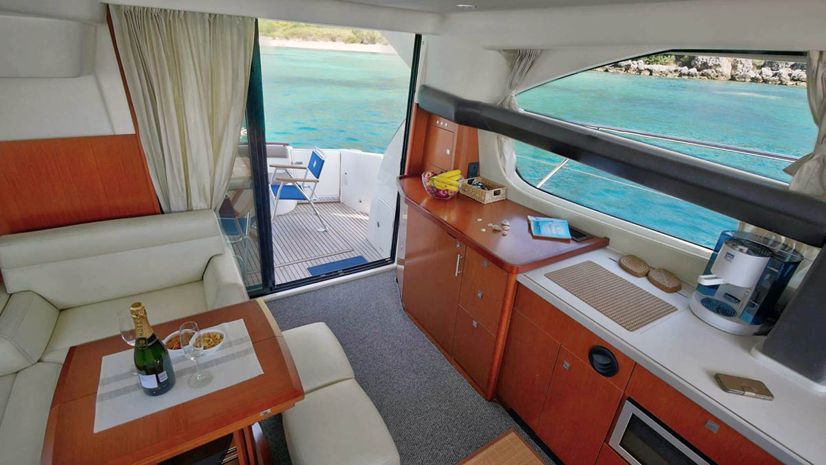 All of the yacht amenities (electricity, air-condition, bow thrusters, flybridge, lobby bar, swimming platform, sunny deck, beach towels, outside shower etc.)